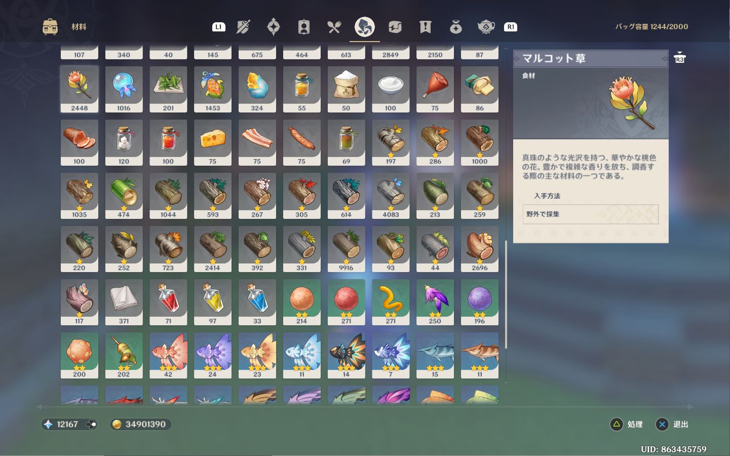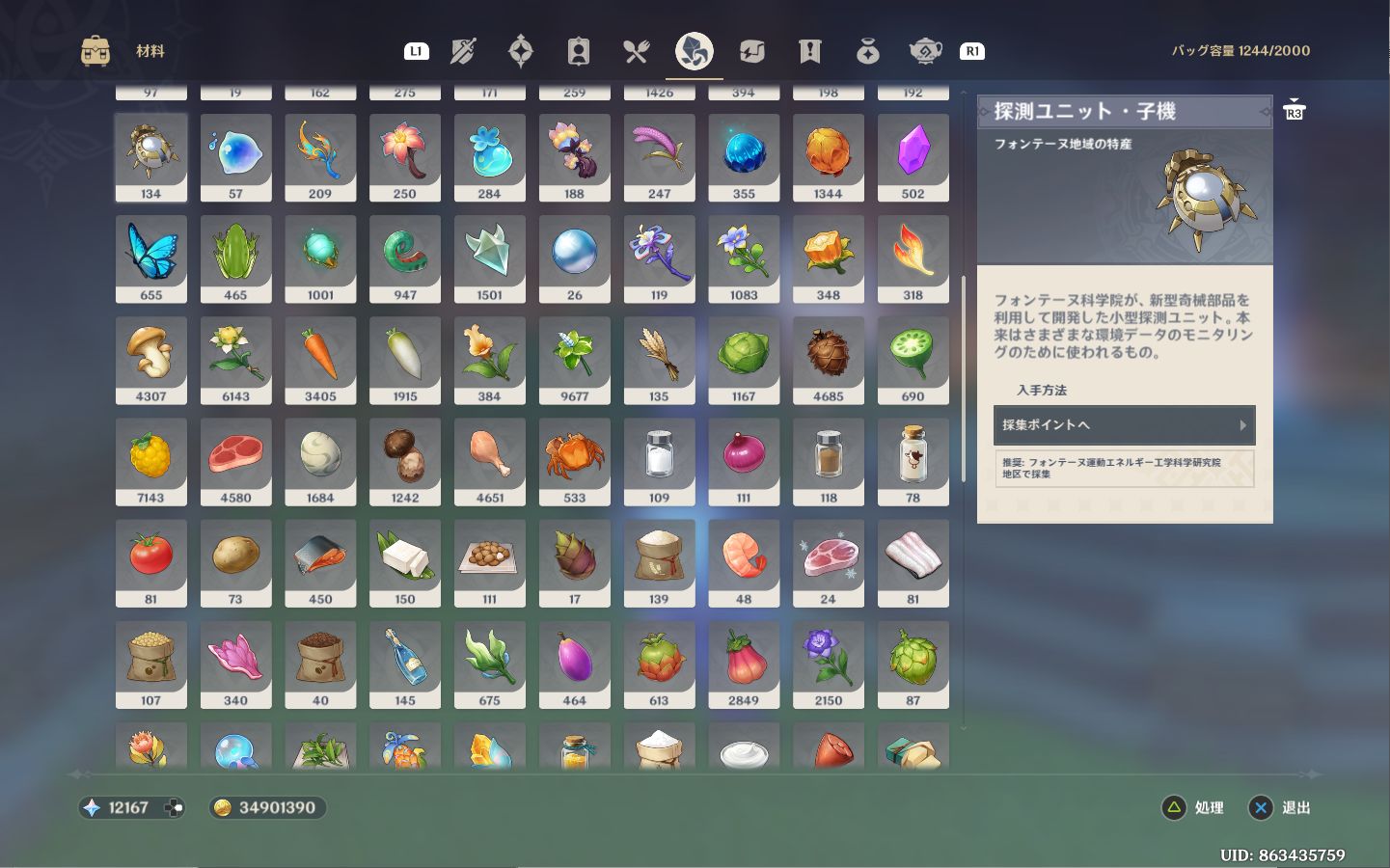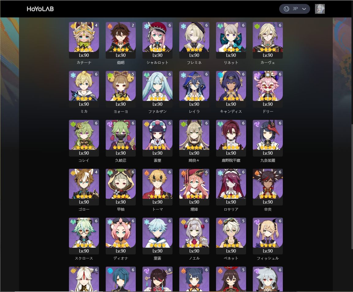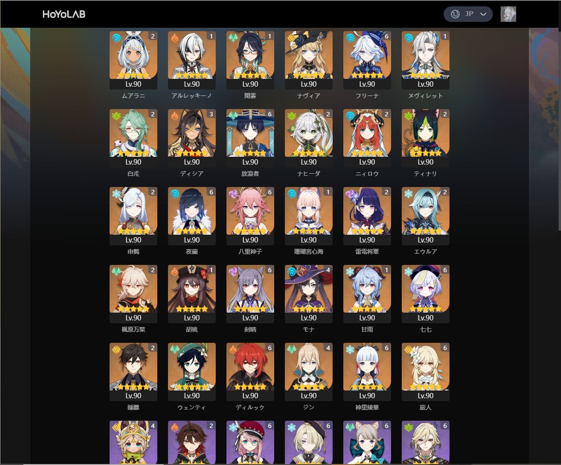 2024年11月03日、PC版HoYoLABでの原神の所持キャラ一覧。