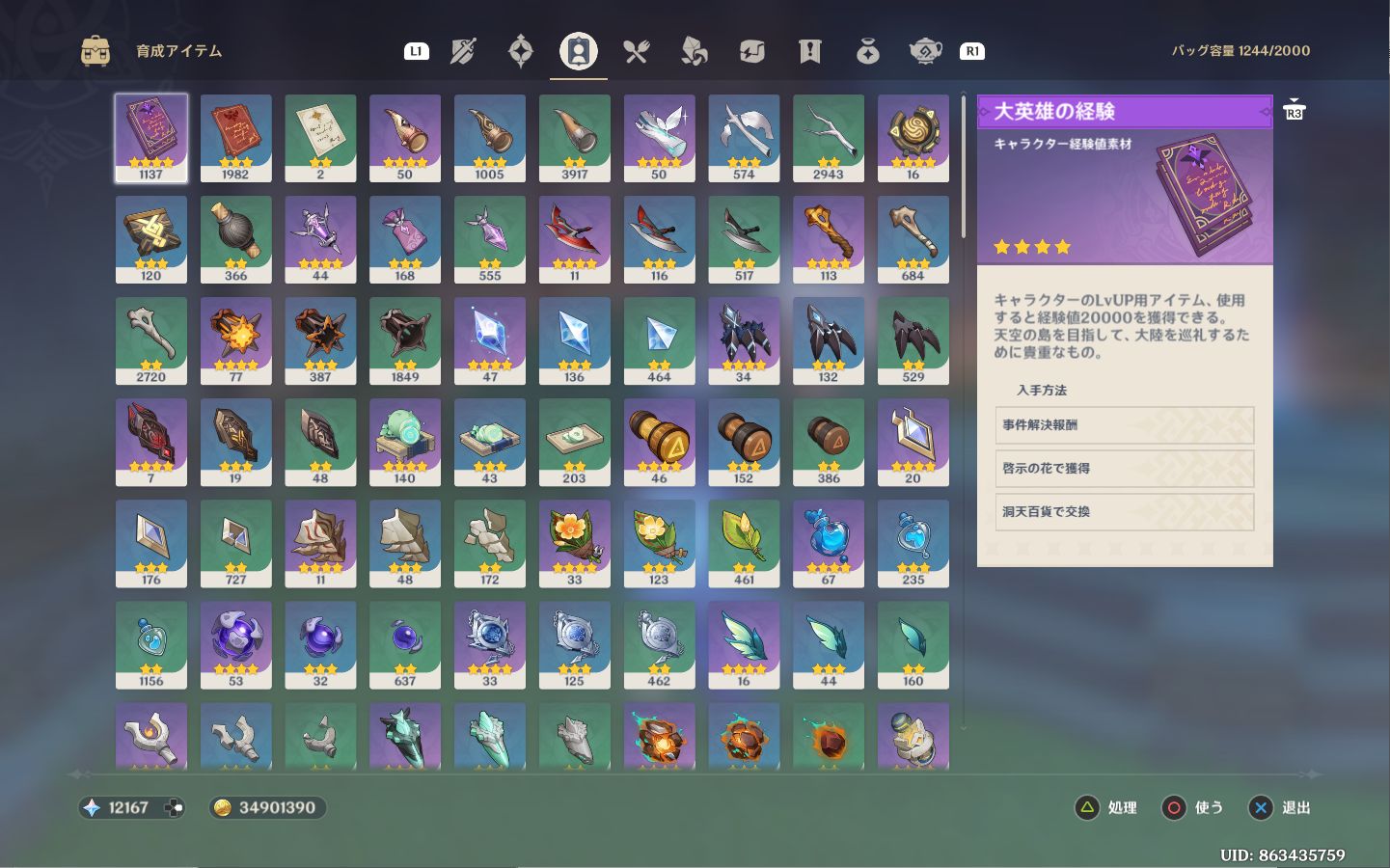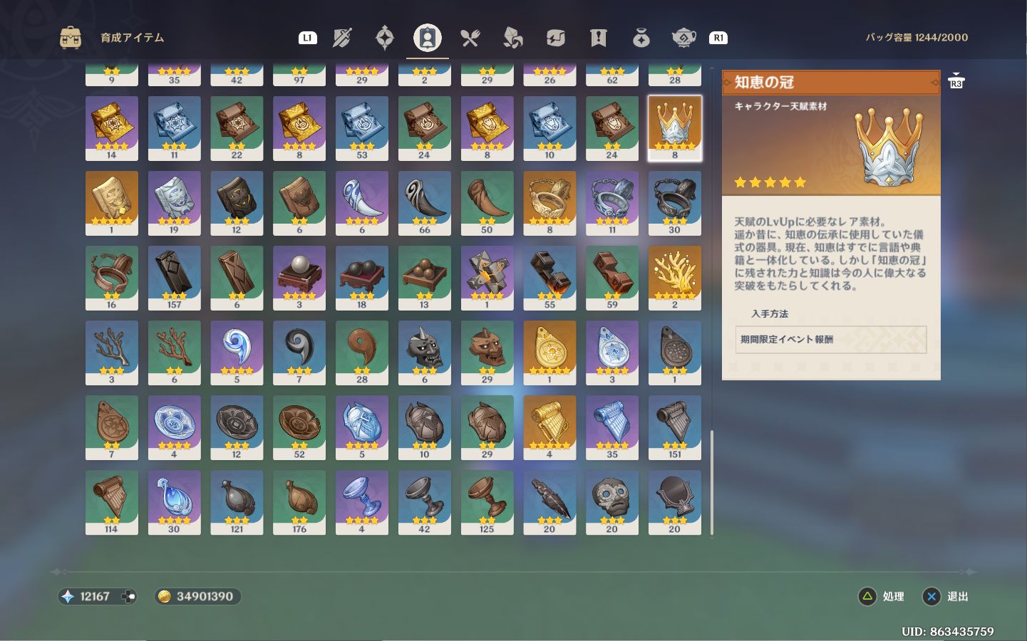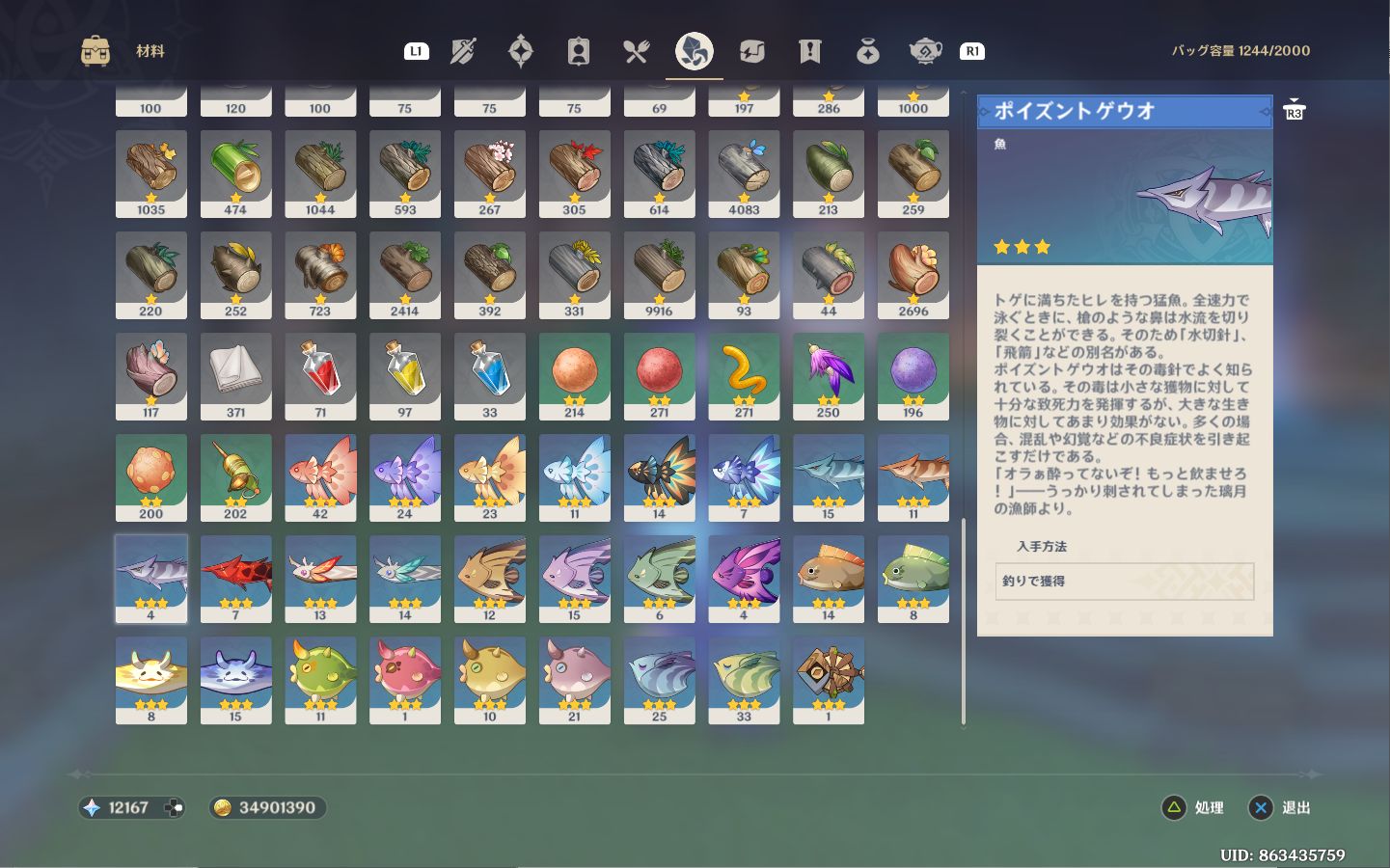 2024年11月03日、PC版HoYoLABでの原神の所持キャラ一覧。